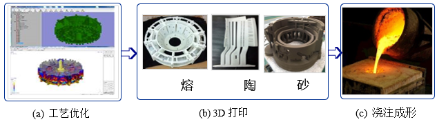 (3)数字化+3D打印技术助力工艺流程变革。新技术的应用有可能变革甚至颠覆传统的工艺方法和流程。例如,3D打印技术可以成形出常规工艺无法制造出的任意复杂形状零件,但由于打印金属种类限制和成本原因,目前无法取代传统的成形技术。但3D打印技术与某些传统成形工艺结合却能产生意想不到的结果。