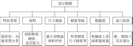 先看看最简单的信息流动的例子。加工一个机械零件,当然要知道其工艺。工艺设计和产品设计之间肯定存在数据流动,工艺设计需要零件的制造特征设计数据作为输入源,主要包含特征类型、材料、尺寸规格、精度等级、粗糙度和加工阶段等,如1所示。在确定加工特征的设计数据后,对该特征的工艺规划数据进行定义。加工特征的工艺规划数据包括该特征的加工方法、机床(机床代码、机床名称)、刀具(刀具号、刀具名称、刀具直径和刀具材料)、工装(夹具和量具)和切削参数(主轴转速、切削速度、进给量和切削深度)等相关数据。其中特征的加工方法根据特征的类型、加工精度和表面粗糙度综合判断来获得; 确定了特征的加工方法后,再根据特征类型、加工方法等数据获得所需要的机床、刀具、工艺装备和切削参数等数据。这些数据都是确定的,而且是静态的。