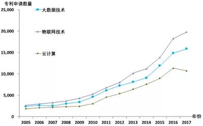 第二阶段为2009年至今的技术应用阶段。在各项基础技术较为成熟后,学术界与企业界纷纷进行了新信息技术在政府、教育、经济、交通、生产等领域的应用尝试。比如,美国政府在2009年启动了Data.gov网站,向公众开放了政府大数据,鼓励大众对大数据进行创新应用。各信息技术的专利申请数量也正反映了这一发展历程。如图1所示,三种技术的专利申请数量趋势基本相同,在2008年及以前,申请专利数量较为平稳,这是因为这些技术的基础技术尚在发展,应用尚不多见;而在2009年及以后,技术发展成熟后,专利申请量持续上升并保持较高的增长率,这对应了技术应用阶段,各技术在各行各业遍地开花,导致专利申请数量持续上涨。