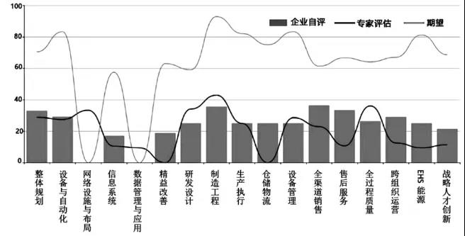 该企业智能制造评估得分为23.6分(满分100分),各模块的评估得分如图5,其中方块表示企业人员自评估结果,线条表示企业人员的期望结果,线条表示专业评估人员的评估结果。