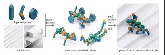 麻省理工学院(MIT)的一支研究团队开发了一种新的机器人设计系统,叫做RoboGrammar,把提供创意的工作交给计算机来做。只要人提出需求,它便会提供最完美合适的机器人构形。RoboGrammar的操作分为三个顺序:定义问题,制定可能的机器人解决方案,然后选择最佳模型,如图3所示。通过这些步骤,RoboGrammar可以设计数十万个潜在的机器人构形。研究团队开发了一种“图形语法(GraphGrammar)”,这是对机器人组件排列的一系列约束。例如,相邻的支腿应该用一个关节连接,而不是用另一个支腿相连。图形语法规则基于节肢动物的启发,例如昆虫,蜘蛛和龙虾等。[2]