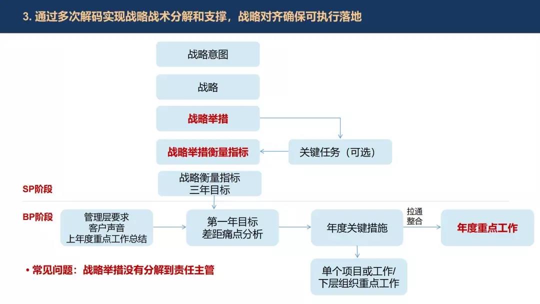 在IT战略制定过程中,首先要制定3到5年战略规划Strategy Plan(简称SP),而且SP需要进行年度回顾与更新。同时SP会分解成战略举措、战略重点,这些战略重点需要由年度工作计划Business Plan(简称BP)来做承接。BP再往下分解,进入到相应部门的KPI以及个人PPC(个人业绩承诺)。这样的话,整个战略从制定到执行就形成了一个闭环。