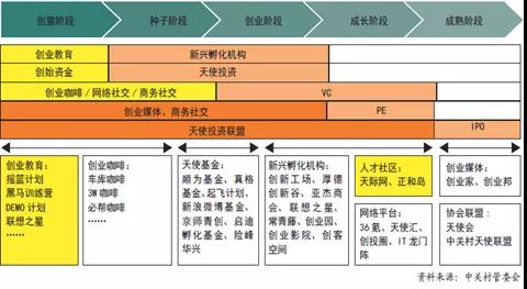 其次,根据对创业企业的服务阶段和专业服务能力不同,可分为创意阶段、种子阶段、创业阶段、成长阶段及成熟阶段,在不同阶段,创业教育、创业孵化、天使投资、创业社区等各类服务靶向集聚,推动创业生态链的良性循环(如图2所示)。