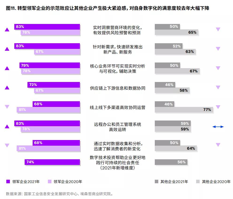 研究显示,企业间数字化能力的差距进一步显现。例如,不足一半(46%)的其他企业对其供应链信息和数据的协同、多渠道高效协同运营表示满意。只有52%的其他企业认为其可以针对新需求,快速研发并推出新产品和新服务,该比例在领军企业中高达83%。研究总结中国企业在持续推进数字化转型中遇到的三大挑战:战略缺位,转型缺乏方向;能力难建,转型难深入;价值难现,投入无法持续。