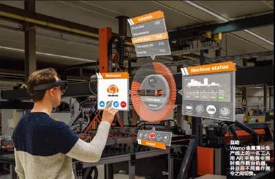 VR、AR技术已经进入工业场景。福特公司就利用VR技术建立了一个虚拟实验工厂,不同地区的工程师可以凭借全息车辆原型进行实时合作。参与者不但可以对3D全息影像进行360度的观察,还可以走进1:1大小的全息车体中,从而完善车辆的设计细节,包括方向盘的位置,油门脚踏板的角度以及仪表盘的设计等。公司不必再制造昂贵的实体原型,也让不同地区的参与者免去了舟车劳顿。波音公司在复杂的飞机制造流程中引入AR培训,极大提升了生产效率。在该公司进行的一项研究中,AR用来引导学员组装机翼部分的30个零部件,总共50道工序。在AR帮助下,学员花费的时间比使用普通2D图纸文件缩短了35%。经验较浅或零经验学员初次完成装配任务的正确率提升了90%。AR让用户交互上升到全新境界。AR头戴装置可以直接将虚拟控制面板投射到产品上,用户可以只用手势和声音指令进行控制。一位佩戴智能眼镜的工人可以观察多台设备的表现并进行操作调整,而不必触摸任何一台设备,见图4。