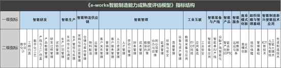 《e-works智能制造能力成熟度评估模型》(图2)面向企业业务应用水平、智能制造基础、智能制造使能技术应用、效益与效能四个维度,立足数字化、网络化、智能化三大方向构建评估模型。其中,企业业务应用水平覆盖产品研发、生产、物流供应链、运营管理等核心业务的数字化,以及产品的智能化、产品的运维服务过程的数字化;智能制造基础涉及智能装备与产线的应用、工业互联的建设基础以及智能制造组织保障与管理基础;智能制造使能技术的应用覆盖ICT新技术、人工智能与大数据技术、先进制造技术的应用;效益与效能则注重对研发周期、生产效率、产品交付、质量提升、设备利用率、能源利用率以及所产生的经济价值等直接效率或间接效率的考察。此外,针对制造业行业不同,其产品与服务特点、生产特点各不相同,评估模型需与行业特点结合,形成相应的行业版本。目前,e-works已建立了装备制造、汽车、电子、电气、纺织服装、食品饮料、化工、冶金等行业的智能制造评估体系,以及军工装备维修行业的智能制造评估体系,并在数百家企业得到了实际应用,效果良好。