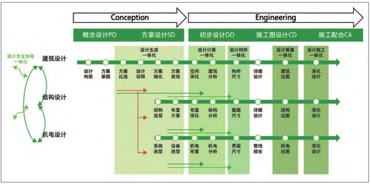 设计概念阶段,充满创意性和发散思维,这一过程注重理念和概念的表达。而在我们通常所说的初步设计和施工图设计阶段,需要把想法和创意逐步完善和落地,这是个系统性的工程深化工作,需要缜密地思考,不断地计算修正,保证系统优化合理并深化各种细节,以保证后续的实施。传统的工作流和业务流并没有很好地解决数据割裂和数据失真问题,而一体化蓝图通过数据层面的融合支持不同阶段的价值,让各阶段的数据能够透明、无缝沟通,打通设计、深化、成本、施工乃至运维各个环节,从根本上重构设计形态,提升设计质量。