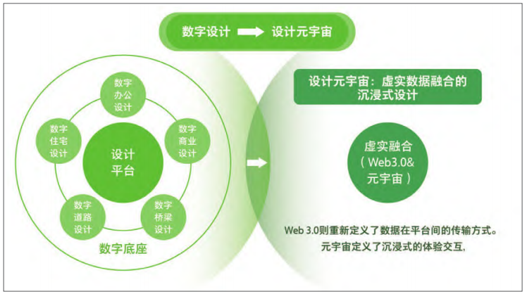新组织与数字身份。数字设计以设计平台为中心,为办公、住宅、商业、道路与桥梁设计等不同业态提供了新的数字化设计方式。未来,以Web3.0为依托,设计师与业主的关系不再局限于甲乙方,而是各自有了新的数字身份,连交付的数字产物也有了新的价值(NFT或是其他形式的数字财产),为平台释放新的能力,成为必不可少的有力支柱。