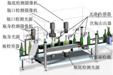 智能空瓶检测分拣装备是一种应用在啤酒、饮料等大型制造自动化生产线上,对清洗后和灌装前的空瓶缺陷进行视觉检测和分拣的装备。空瓶缺陷主要包括瓶口、瓶身、瓶底破损、可见异物和残留液等。该装备如图2所示,由空瓶传送系统、多成像系统、视觉检测系统、残留液检测和分拣装置组成。该装备采用直线式传送机构,当空瓶分别运动到瓶口、瓶身、瓶底检测工位时,触发光电传感器,多成像系统自动获取各检测区域的图像,视觉检测系统分别对各工位图像进行处理。在图像处理过程中,对瓶口、瓶身、瓶底检测区域进行定位,然后分别对各区域进行缺陷检测,其中瓶身和瓶底采用基于局部掩膜的高频系数提取和阈值方法,瓶口采用分块和基于灰度的多层神经网络分类方法。最终分拣装置根据多个工位检测结果将存在缺陷的空瓶剔出生产线。