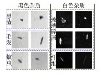 基于视觉检测和控制技术的智能制造装备虽然功能、作业对象、结构、运动控制方法、图像处理方法差别较大,但其原理方案却基本相同。大型医药智能视觉检测分拣装备是应用于制药自动化生产线上,对安瓿、口服液及输液瓶等药品质量进行高速、全自动、在线检测的装备。待识别的杂质主要包括图4所示的玻屑、毛发、纤维等微弱可见异物如和瓶体破损、瓶口封装污染等,该装备还可以根据检测结果自动剔除不合格品。医药质量检测面临杂质类型多样,微弱(检测标准为50µm及以上),部分杂质附着于瓶底等难题。装备采用多工位成像和精密旋转–急停成像机构,获取杂质的运动图像序列。杂质检测采用序列图像轨迹分析的方法,首先通过基于边界的定位方法确定检测区域,然后对相邻帧图像进行空洞填充差分,并采用基于脉冲神经网络和Tsallis熵的图像分割算法提取杂质,通过杂质不变特征分析运动轨迹,并实现杂质的识别。在输出星轮处,根据检测结果,装备将药品进行分类。
