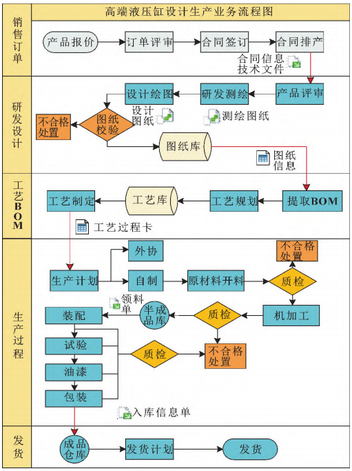 图1所示为某高端液压缸企业设计制造的业务流程,该流程将企业运营划分为销售订单、研发设计、工艺BOM以及生产过程和发货5个阶段。整个流程以产品报价为起点,通过合同的签订及排产将技术信息进行传递后实施测绘、绘图等设计工作。完成图纸BOM信息的收集,完成工艺的规划和编制,最后在生产过程中穿插质检作业,完成工序级别的管控。通过全面采集关键过程记录,以推动市场、技术、生产、质量、采购等多部门业务高效协同。