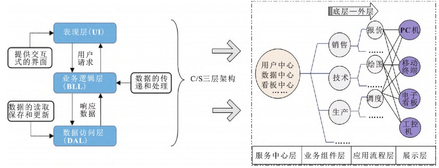 如图2所示,该平台由典型的C/S三层架构演化而来,并以服务中心层、业务组件层、应用流程层和展示层构成。服务中心层主要由用户中心、数据中心、看板中心、报表中心等组成,为后续应用层提供基础服务和接口;业务组件层将销售、技术、生产、采购、仓库、质量等业务功能打散为相对独立的组件供应用流程层使用;应用流程层使用服务中心层的建模中心,将业务组件层中各类微服务组件进行组合和编排,生成相互关联且有约束关系的业务功能模块,包括MES中的计划、调度、加工执行等;展示层通过计算机、移动终端、工控机、车间显示大屏等方式,生成交互窗口,对数据进行操作以及将功能结果进行展示。