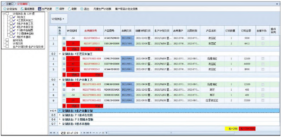 如图8所示,平台集成ERP对订单数据的记录和流程管控的特点,通过抓取系统中关键业务阶段的各个时间节点来划分状态,包括订单处理状态、技术绘图状态、生产计划状态、工艺编制状态以及加工状态和入库状态。通过查询各阶段的订单实时流转情况和数据统计来实现订单的精细化管理以及产品的全生命周期的跟踪管控。拒绝将问题淹没在庞大的数据海中,实时且清晰明了地将瓶颈阶段和积压严重的业务块暴露出来,助力管理者进行针对性的及时调整和战略管控。