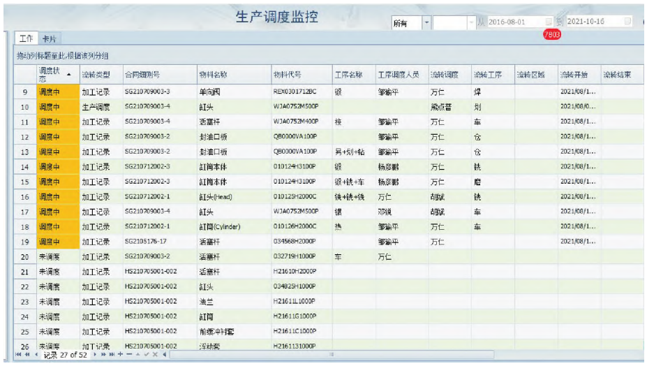 如图11和图12所示,管理人员可以对每一个零件的生产进行调度监控和跟踪所有加工工序状态的变化。不论零件处在哪一个工序环节,都可以从系统直接看到其调度和加工状态,当出现质量问题或者其他异常状况时,也能及时查看报警信息。通过这一追溯过程,企业可以很大程度改善由于单件多而导致的管控混乱的局面。