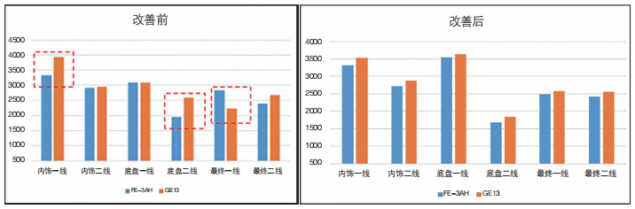 改善后(图 5 右):调整作业内容,两名员工各负责一侧,对所负责一侧的内饰及外饰进行检查,这样就减少了作业过程中的动作浪费。