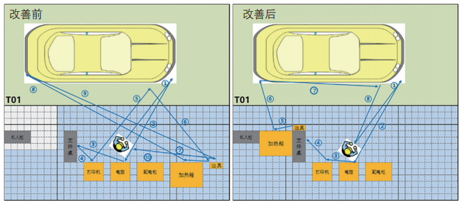 改善后(图 3 右):通过合理布置现场,同时合理安排取料件数,大大减少了走动的趟数,同时通过优化路线,也缩短了走动的距离,减少了必要非增值时间。
