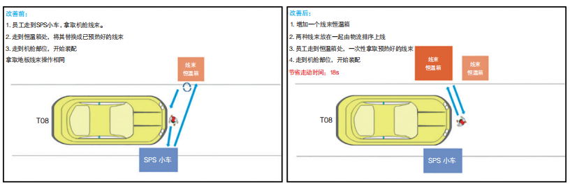 改善后:增加一个线束恒温箱,线束由物流直接排序上线,员工走到恒温箱处,直接拿取预热好的线束之后走到机舱位置开始装配作业即可,节省了“取换”线束时间以及走动时间。