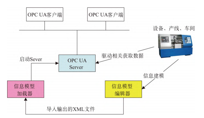 OPC UA和信息模型是上述方案核心,鉴于OPC UA规范实现复杂,推荐使用OPC UA快速开发机制。如图3所示,首先选用通过认证的可剪裁精简OPC UA协议栈软件开发包(Software Development Kit,SDK),然后使用信息模型编辑器和信息模型加载器两个工具。其中,信息模型编辑器可提供信息模型模板库,用户使用这些模板库可快速完成制造装备复杂信息模型的创建与修改,并自动生成描述制造装备信息模型的XML描述文件;信息模型加载器以XML文件为输入,对其进行自动解析并实现OPC UA地址空间的自动生成、地址空间节点与驱动数据的自动映射关联,最终自动生成制造装备OPC UA信息模型服务器,可以被任何标准的OPC UA客户端访问。