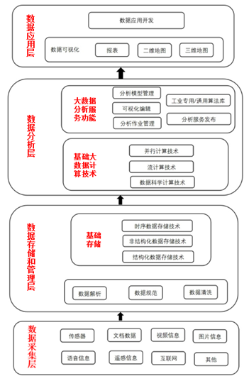 大数据的架构在逻辑上主要分为四层,即数据采集层、数据存储和管理层、数据分析层及数据应用层,如图3所示。