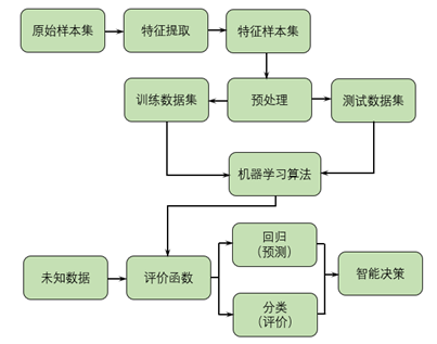 如图 6所示,机器学习的基本实现方式可描述为:将具象的概念映射为数据,同目标事物的观测数据一起组成原始样本集,计算机根据某种规则对初始样本进行特征提取,形成特征样本集,经由预处理过程,将特征样本拆分为训练数据和测试数据,再调用合适的机器学习算法,拟合并测试评价函数,即可用之对未来的观测数据进行预测或评价。