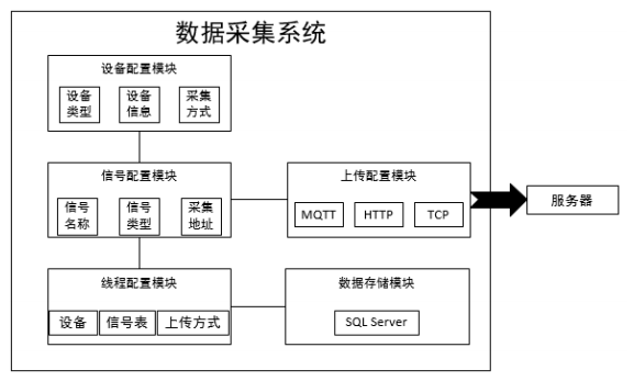 系统整体设计是基于.NET Core,语言采用C#进行开发,数据存储采用SQL Server数据库。系统主要由五大模块组成,分别为设备配置模块、信号配置模块、线程配置模块、上传配置模块和数据存储模块,如图2所示。
