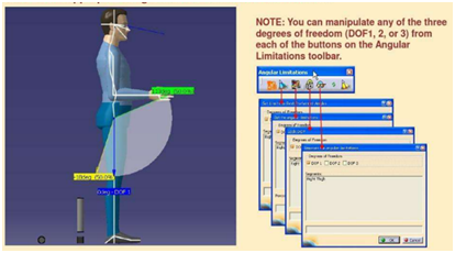 姿态分析是通过求解人体的运动学和动力学模型对行走、定位、抓取和举放等姿态进行评估,以及进行人体受力及疲劳分析等。针对产品装配过程中人体姿态的计算,可根据人体参数、作业点、作业力方向、人体位置及人体操作方式等计算上下体姿态角,判断可工作域,自动调整人体姿态,以实现自动控制及姿态计算,并使人体达到最舒适状态。