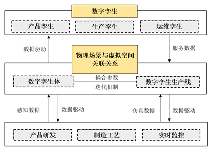 数字孪生技术是智能制造发展的方向,通过工业互联网、大数据、建模工具、仿真软件、可视化手段等,实现物理世界与虚拟世界的互联互通,能够在虚拟世界里面事先模拟各类场景,然后将最优化的结果应用于现实世界中,以更低的成本获得更高的效益,数字孪生技术构架如图10所示。数字孪生分为:产品孪生、生产孪生和运维孪生,分别模拟产品研发中的各类测试、制造工艺的模拟仿真、生产线的模拟仿真和实际生产过程的实时监控、产品上市以后的运行状态等。