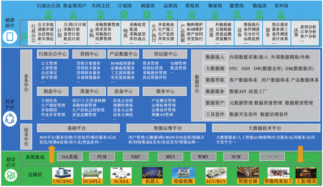 “中台”是协同的核心,业务中台实现支撑公司、供应商协同、客户业务服务化创新应用,数据中台完成公司技术、成本、制造质量、资源、人力、制造、服务、管理等业务域的数据共享及服务化,技术中台为上述两大中台提供基础平台,保证服务安全稳定。“后台”为系统集成以及边缘层的数据交互,包括ERP、MOM、PLM、SRM、CRM等。建立中台化结构,赋予组织轻量化的快捷迭代能力,可以将业务服务化,从而支撑业务快速变化和创新。作为全单位人员使用,协同平台天然具有成为运营中心的基因,能够更好地实现连接和系统的全面融合,以及对业务组织和人员的赋能。