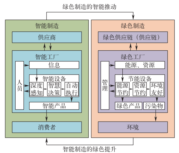智能制造和绿色制造都是当前制造业的热点话题,企业在推动智能制造时会发现智能制造和绿色制造二者其实是密不可分的,因为绿色制造中会涉及智能化的提升,同样智能制造推进中亦会有关于绿色零碳等的规划设计和实施,比如环保等方面,二者相辅相成、互为促进。智能制造和绿色制造关系如图1所示。
