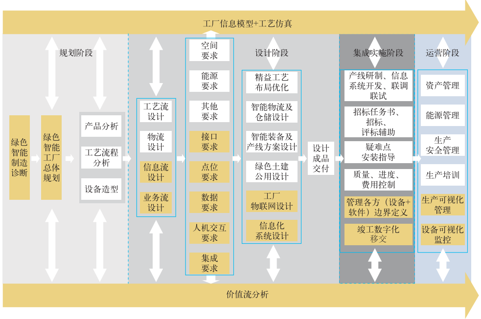 智能工厂涵盖精益改善、工艺流程再造、物流、自动化改造、工厂物联网、信息化应用系统、土建公用设施、建模仿真和数字孪生等建设内容,是个复杂的系统工程,投资大、周期长,因此在实施时前需进行整体化规划和顶层设计。