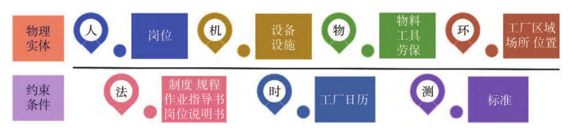 第二个层级为数字化工厂基础层,从管理七要素“人、机、物、环、法、时、测”出发,根据行业特点和管理需求进行分类和定义,并建立相互间关联关系。图1为管理7要素示意图。