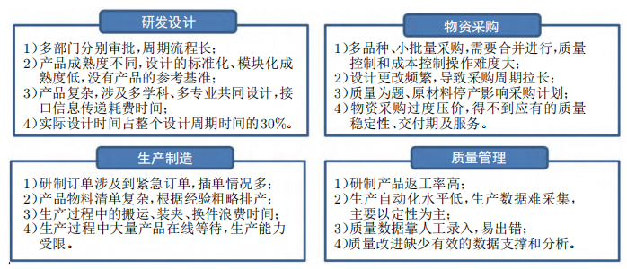 以典型雷达电子装备为例,从订单到交付(OTD)主要包括研发设计、物资采购、生产制造和质量管理4个大的层面,具体如图2所示。每个层面在产品生产的全生命周期中都存在着一定的问题,而这些问题往往不仅仅是各层面本身的技术问题,更多的是整个生产流程、各个生产环节彼此牵制关联形成的。因此,面向雷达电子装备多品种、小批量、变节拍的柔性生产需求,消除现有生产端的业务痛点与难点,完成数字化转型,首要任务是自上而下全流程梳理与优化。