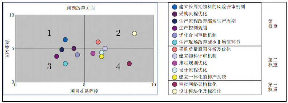通过对业务过程的改善方向权重进行分析,形成问题改善地图,如图7所示。根据图7所示的问题改善地图可以找出项目难度低且KPI指标高的改进项,作为首要改进目标来实施,按照评价等级1—4,逐步突破,将问题全部解决从而提升企业效率。