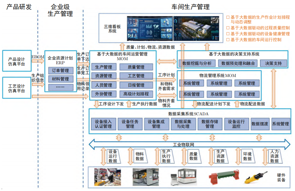 围绕数字化工厂生产管理系统架构(图9),以生产过程的端到端数据贯通为目标,搭建企业资源规划(ERP)系统、车间运营管理系统(MOM)、仓储管理系统(WMS)、监控与数据采集(SCADA)系统、车间可视化展示系统(WVS)的车间信息化管理架构,实现基于大数据的工厂运营管理。