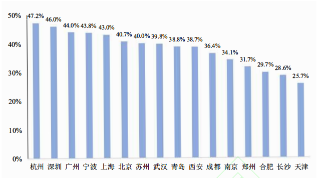 笔者进一步探究北京、上海、广州等16个一线城市的中小企业数字化转型情况。有数据显示,有7个一线城市的中小企业数字化转型比例突破40%,包括杭州、深圳、广州、宁波、上海、北京和苏州。其中,杭州、深圳、广州的中小企业数字化转型比例位居前列,分别为47.2%、46.0%、44.0%。合肥、长沙和天津的中小企业数字化转型比例相对较低,分别为29.7%、28.6%、25.7%。总体而言,东部沿海地区一线城市的数字经济基础优势明显,数字化转型潜力大,已成为中小企业数字化发展的领先区域。随着数字经济发展环境逐步优化,数字人才培养体系日益完善,数字技术支撑力度不断增强,一线城市的中小企业数字化转型进程步入“快车道”。