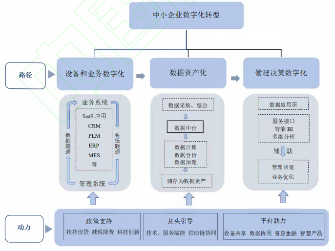 从现实看,大型企业通常已具备良好的信息化基础,因此,大型企业推进数字化转型更应侧重“数字升级”,即通过对传统的ERP、CRM、OA等信息系统的升级改造,将已经成熟应用的信息软件升级为更高效的数字化工具,例如,应用大数据平台、云计算等,低成本、高速率地实现企业的数字化转型,更好地满足大企业对数据联通、智能运营和决策优化的需求。