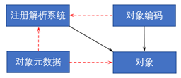 对象标识解析体系结构如图1所示,其包含对象编码、对象元数据和注册解析系统3部分组成。对象编码是针对对象的唯一标识,通过与对象规范的元数据进行关联,依托注册解析系统,得到对象编码所关联的规范的信息。