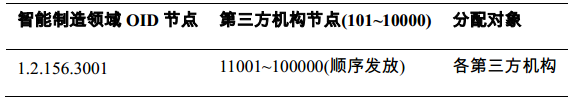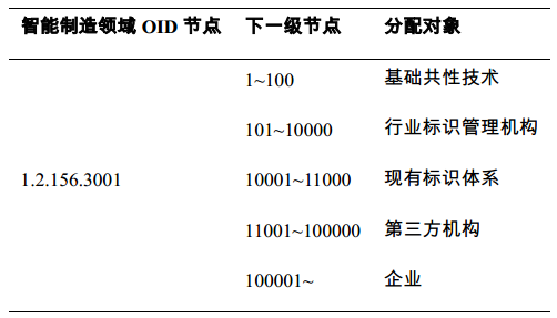 智能制造领域OID节点编码是由智能制造对象标识顶级运营机构向国家OID注册中心注册,由国家OID注册中心统一分配,其数字值为1.2.156.3001,其业务范围是为智能制造领域的各类对象进行规范的标识解析,统一管理。下一级节点编码由智能制造标识运营机构规划,分配方案见表1。
