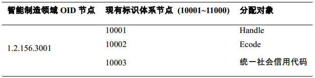 现有标识体系节点由现有标识体系运营机构向智能制造标识运营机构申请注册。其业务范围是针对现有标识体系中的对象,提供基于OID的标识解析服务。分配方案由智能制造标识运营机构制定,如表4所示。