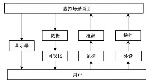 基于虚拟制造的虚拟油管监测系统通过建模仿真技术与软件开发技术,实现虚拟人机交互,并通过运用几何建模、物理建模、运动建模、行为建模、交互映射与模型分割等实现实时仿真。该系统通过软硬件相结合的设计,实现虚拟场景的构建与仿真。虚拟场景的设计包括可视化、数据处理和用户交互等。虚拟场景设计结构如图2所示。
