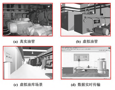 本文根据如图 4( a) 所示的真实油管现场实际环境搭建虚拟环境。虚拟油管如图 4( b) 所示。虚拟油管监测系统实现了如图 4( d) 所示的数据实时传输与虚拟人机交互,最终实现操作人员的远程智能测控。图 4( c) 为应用基地实际场景与虚拟监控画面。