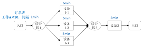 通过连接线(connector)来定义生产活动顺序是最简单的方式,如图1所示,入口位置依据订单表,每间隔1min产生1个工件A,共10次。工件A沿连接线,先进入缓冲区1等待,一旦3台并行设备(设备1-1、1-2和1-3)中有1台空闲,就进入该设备加工,加工时间5min,完成后进入缓冲区2等待,当设备2空闲后再进入加工,加工时间8min,最后流入出口,工件生产任务完成。