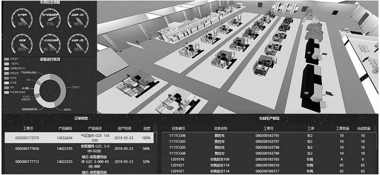 展示层设计为两大部分,即:车间综合大屏和机床综合大屏。车间综合大屏围绕车间综合效能、设备总体运行情况、订单进度和车间生产状况分类展示,并融合ThingJS展示3D车间排产情况,以实时视觉和数据预警强化对排产的监控。机床综合大屏则围绕单一生产设备,从工序产量分析、产品缺陷分析、OEE值和工艺参数等维度表达设备的运行状况和运行质量,实现生产单元的实时监控。