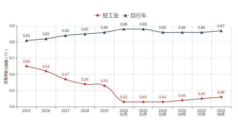 2015年以来,自行车行业TC贸易竞争力指数持续保持高位且有小幅上升,表明行业国际贸易竞争力不断加强。2019年该指数较2015年上升0.07点至0.88;2020年6月该指数为0.87,较2019年末小幅上升0.01点,比同期轻工业平均贸易竞争力指数高0.41点。