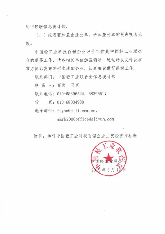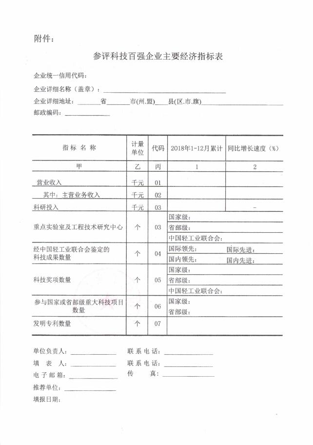 关于开展2018年度中国轻工业科技百强企业评价工作的通知