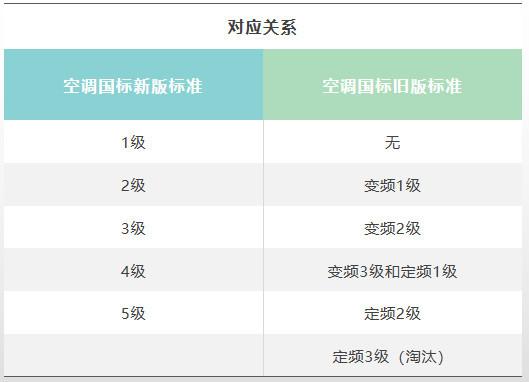 新能效标准总共分为五个等级,其中最高的能效一级是明显高于旧能效标准的要求的,已经达到了国际领先的水平。其余的等级简单来说就是,旧能效标准中原有的变频1级对应的就是新标准中的二级能效,旧变频2级对应的是新3级能效,旧变频3级和定频1级能效对应的是新4级能效,旧定频2级能效对应的则是新5级能效,而原有的定频3级能效则面临淘汰。