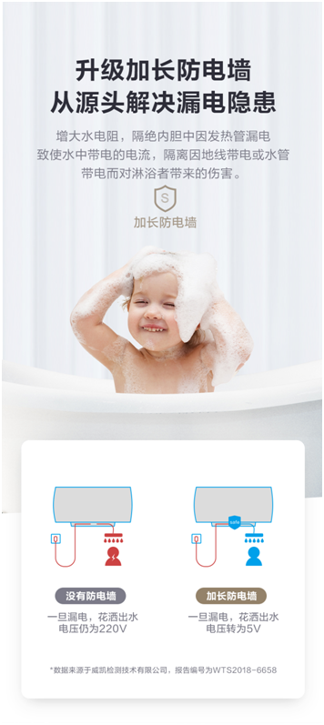 上述问题都会使电热水器的安全性大打折扣,为了保证消费者的洗浴安全,美的电热产品率先行动起来,在每一款电热水器上都应用防电专利技术,成功解决了由于热水器内部零件故障引发的由内向外导电,以及由于接地不良及环境带电引起的由外向内逆向漏电的问题。当漏电时,美的防电墙会在人体和内胆带电水之间建立一个电阻(水阻),经过检测,使用加长防电墙的美的电热水器在人体上的分压低于5V,这样的电压对人体来说不会造成伤害,从而有效的保障了人们的安全。
