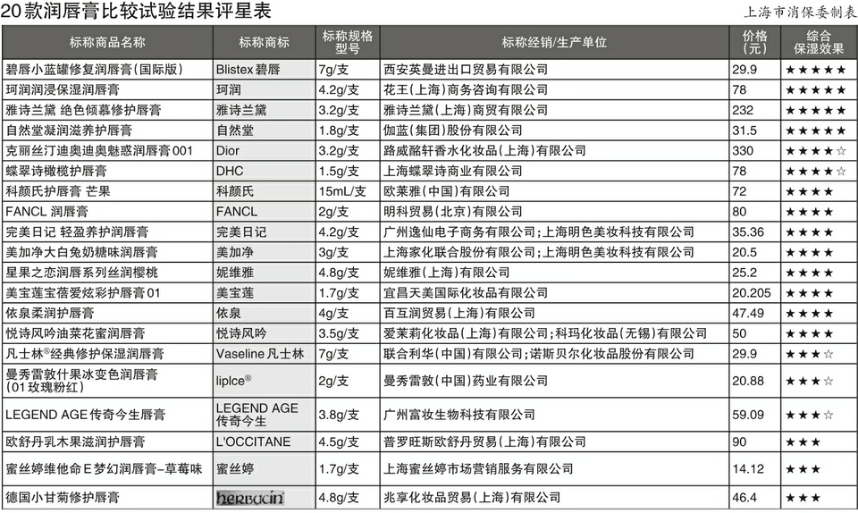 图:20款润唇膏比较试验结果评星表