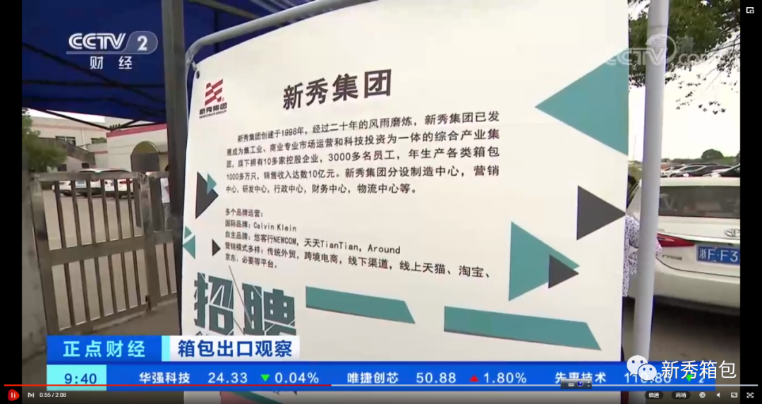 6月27日上午9时,央视财经频道播出的《正点财经》栏目推出“箱包出口观察”专栏,节目首先聚焦浙江平湖箱包出口情况,作为 副会长单位、中国皮革协会副理事长兼任箱包皮具专业委员会会长单位的新秀集团总经理赵胜梅接受了记者采访,并带领记者深入生产一线,向记者介绍企业目前的箱包生产情况。