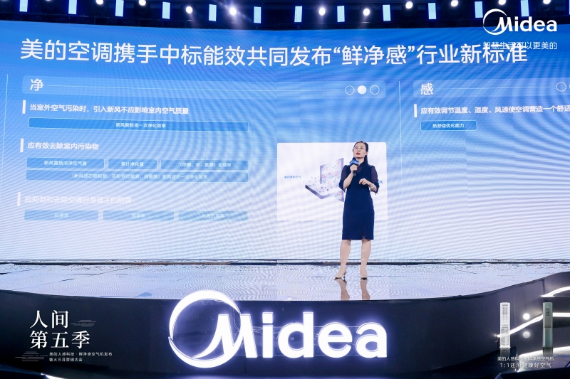 美的鲜净感空气机作为空调行业的新物种,直面空气环境与场景人群的双重复杂问题,创新探索“传统空调”的超强能力和“健康空气”的维度专业,击破传统产品痛点,为行业不断拓展成长空间。以技术驱动行业革新的同时,美的也在积极推动行业合规健康发展,会上与新品一同问世的还有美的空调携手中标能效共同发布的“鲜净感”行业新标准,中标能效科技(北京)有限公司高级总监齐云从“鲜”、“净”、“感”三个维度进行了全面解读,让鲜净感空气机有标可依。